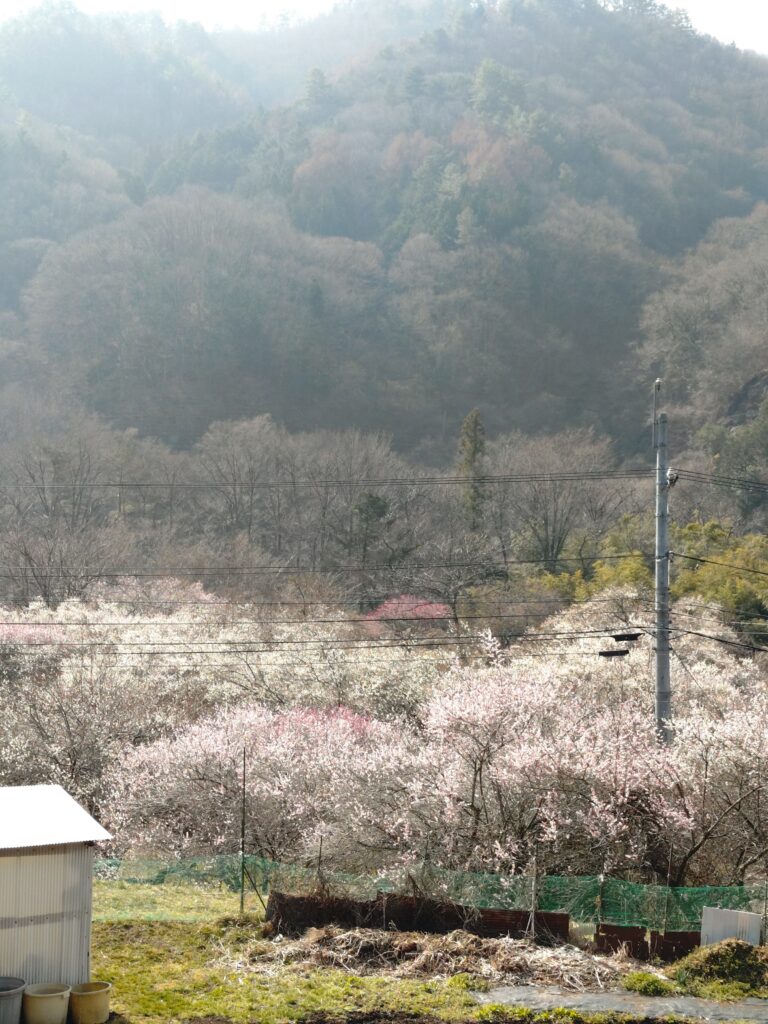 道の駅三岳の近くには、梅の栽培地として有名な三尾地区があり、ちょうどいま、梅の花が咲き誇り、素晴らしい景色となっています。
